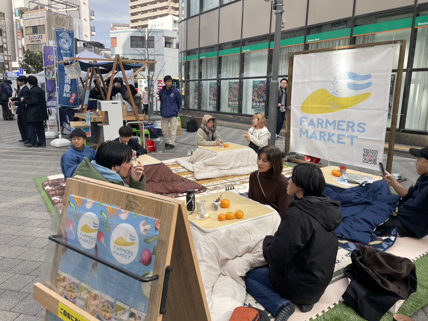 | 活動内容 | 1/15(木)「うみべのFARMERS MARKET」の会場設営&ブース運営、撤収のお手伝いをお願いします。 ■8:00 サンパレット広場(りそな銀行前)集合・説明 *会場設営時、荷物運び等あるため軍手をご用意ください。 ■ 開始前の備品搬入・会場設営(屋台、こたつの組み立て、その他備品の設置) ■11:00-16:00 イベント時 運営業務(飲食エリア対応) ■17:30頃 撤収作業・解散 |